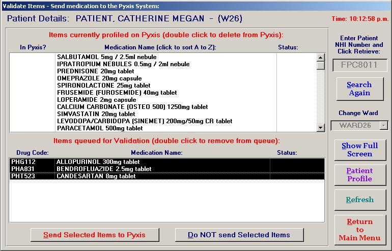 As with the profiling example above, the patient's NHI number is entered into the box on the right hand side of the screen and the medications already profiled for her on the Pyxis system are displayed in in the top half of the screen. These too can be sorted in the order they were profiled (default) or in alphabetical order. To remove any of these medications from the Pyxis system, the user can double-click on the medication & it will be deleted. Any medications that have been added to the profile but have NOT been clinically reviewed will be displayed in the bottom half of the screen. In this example. we can see the Allopurinol, Bendrofluazide & Candesartan tablets that were profiled in the previous steps. The pharmacist reviews the medications already profiled in combination with those that have been newly profiled, and selects each medication they want to send to the Pyxis system.